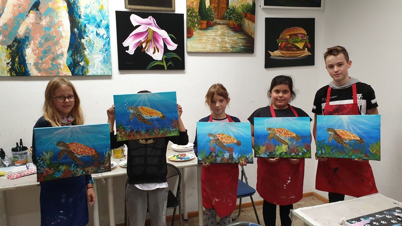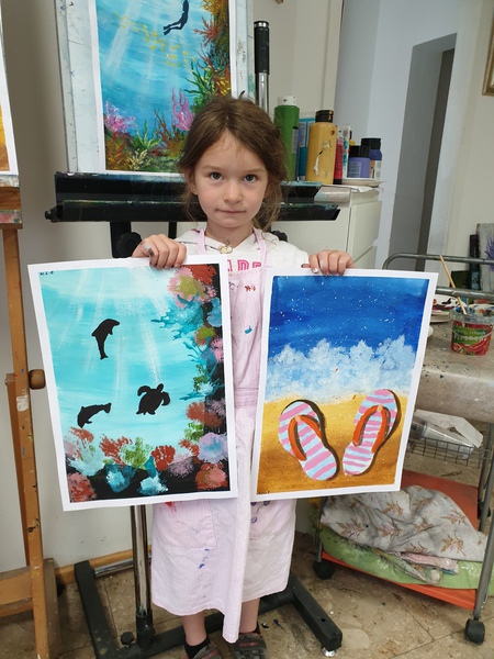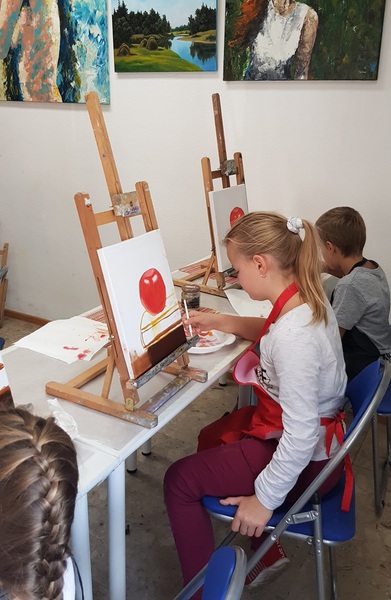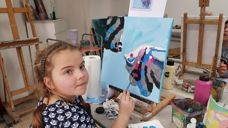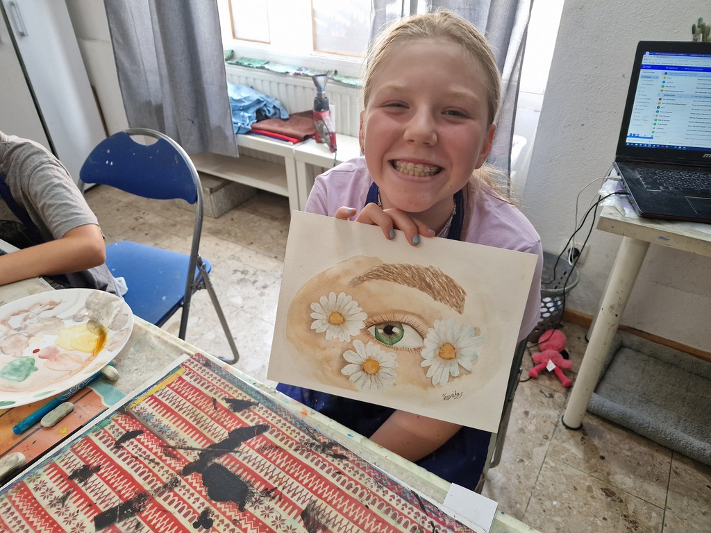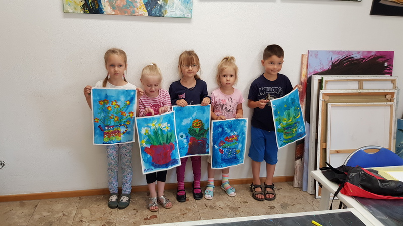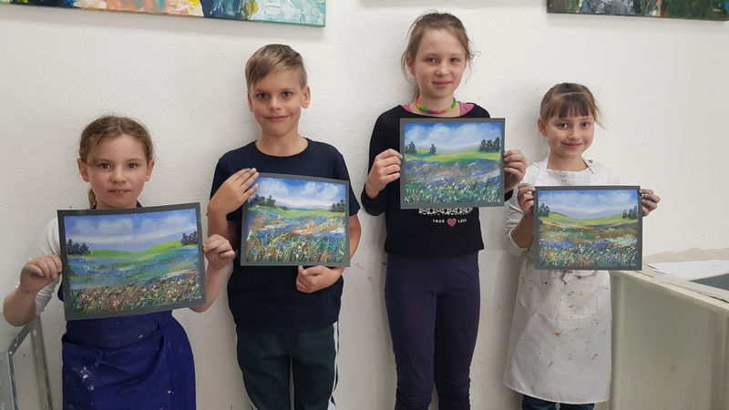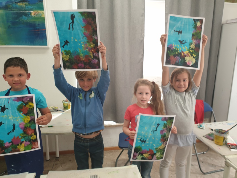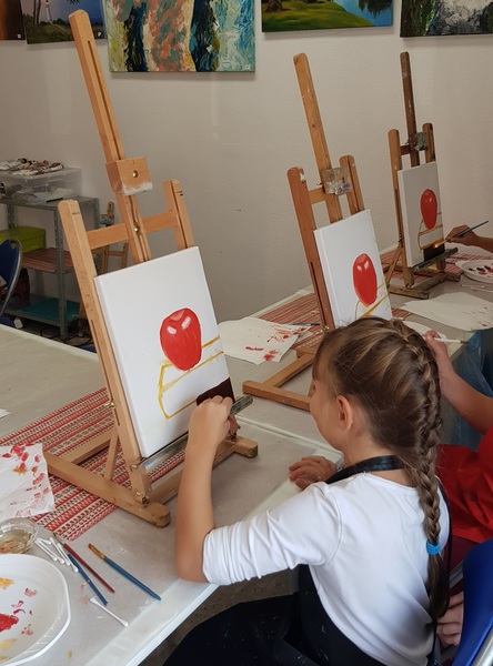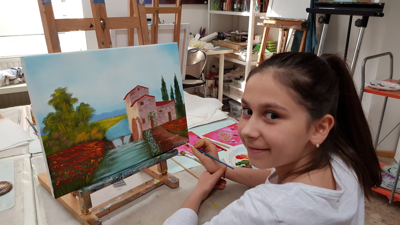 Bei einem Wochenkurs können die Kinder selbst bestimmen was sie malen und dies im eigenen Tempo tun. Ich habe ganz viele Beispiele mit Tieren, Landschaften, Stillleben, Blumen usw. Das Kind kann auch selber etwas vorschlagen und wir arbeiten dann an der Ausführung gemeinsam.