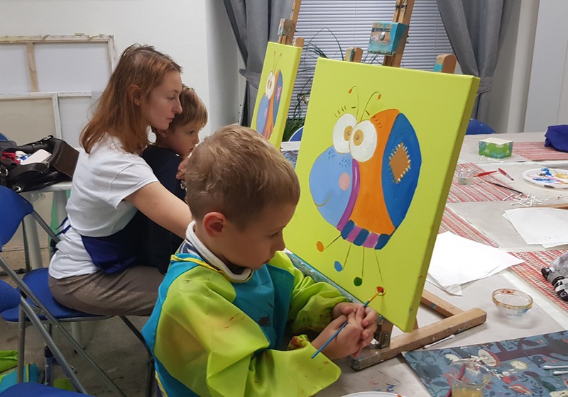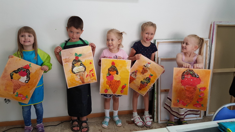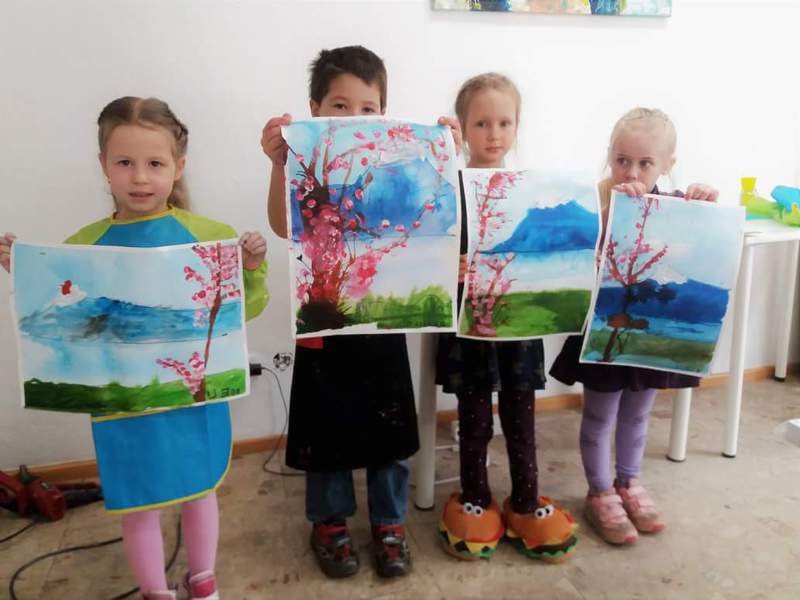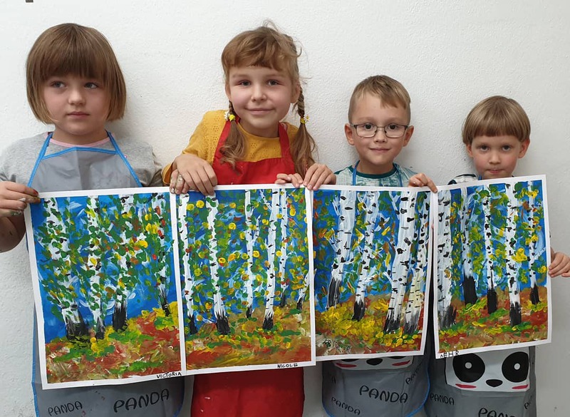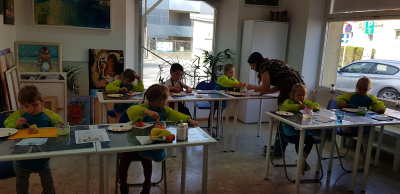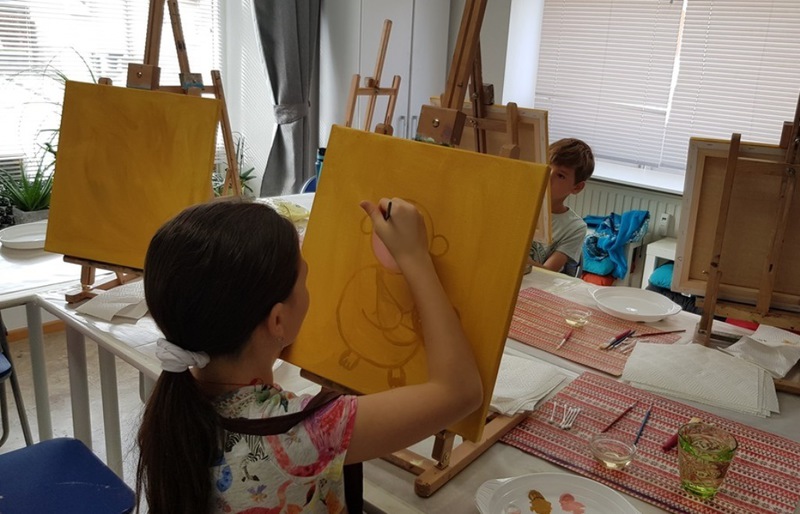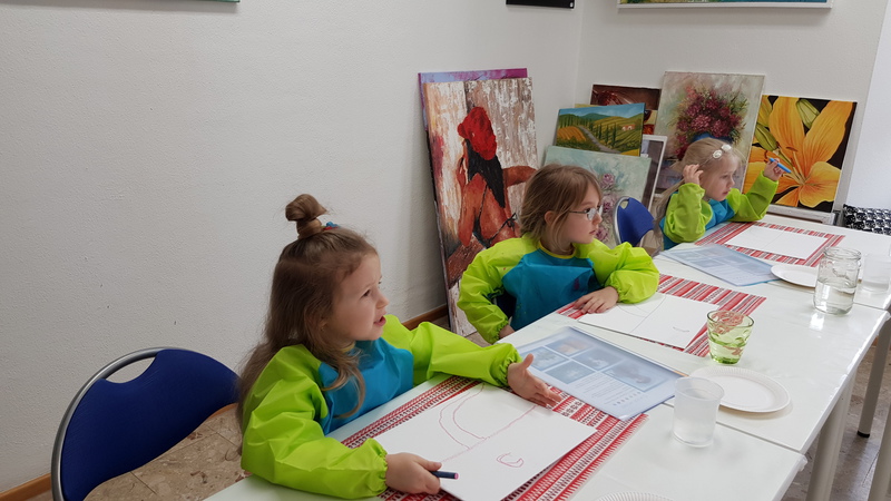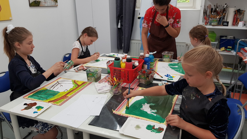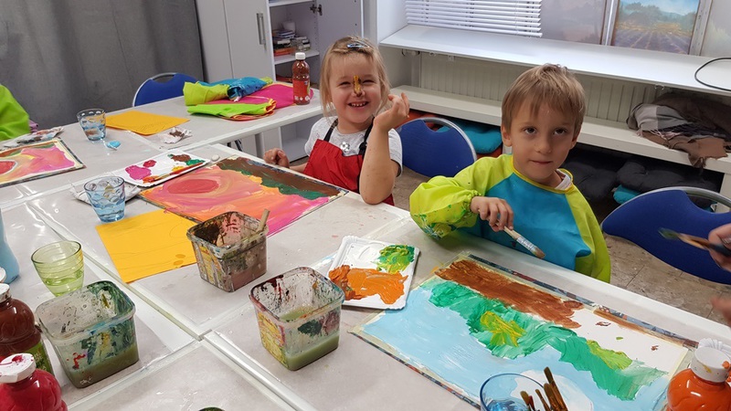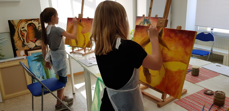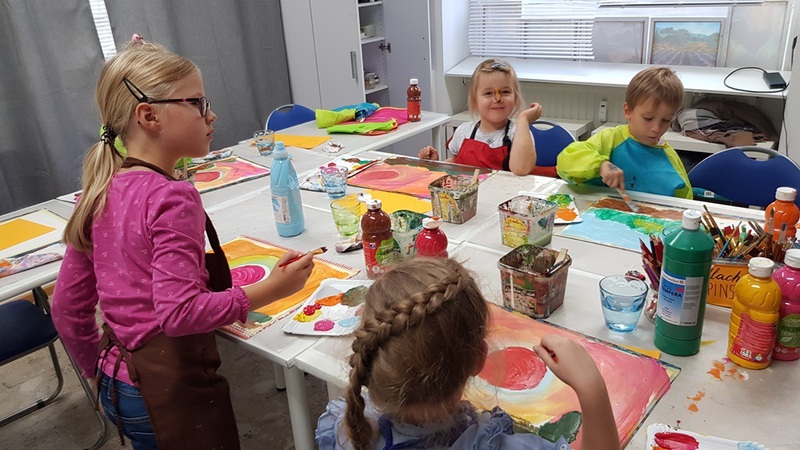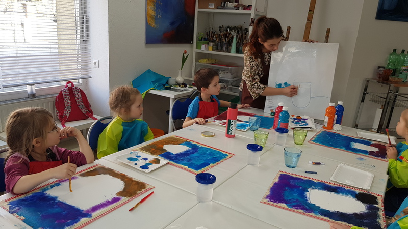 Wir unterrichten auf Russisch und Deutsch. Dies ist eine fabelhafte Möglichkeit für bilinguale Kinder neben der Malerei auch eine Sprache aufzusaugen.