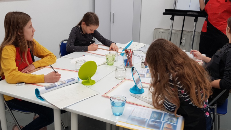Eine Unterrichtseinheit in der Kunstschule dauert 90 Minuten und findet einmal in der Woche zu einem festen Termin statt.